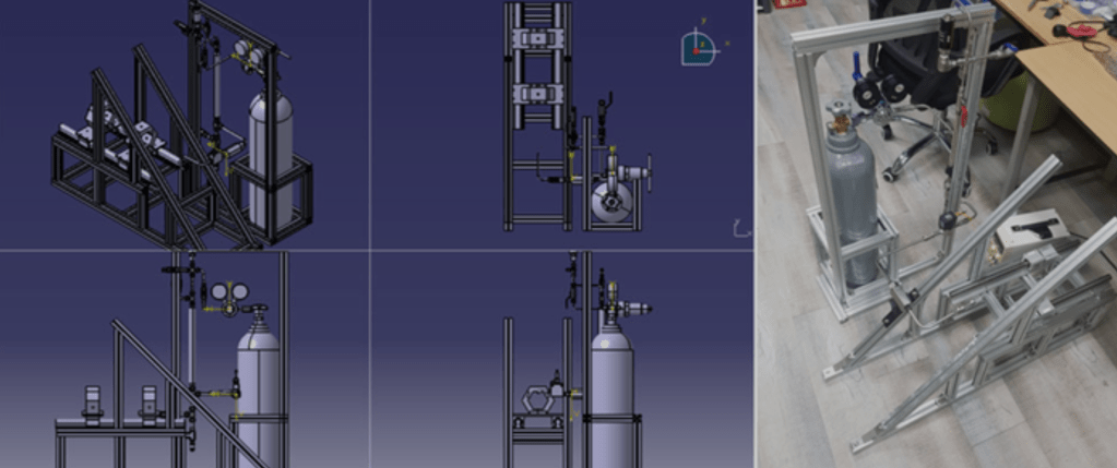 A hybrid rocket using HAN (Hydroxylammonium Nitrate)-based oxidizer was analyzed for its combustion characteristics. By synthesizing and concentrating the HAN solution to achieve a uniform concentration, a lab-scale combustion test setup and a 10 N class thrust engine were designed and built. Additionally, the oxidizer delivery system’s integrity and functionality were verified through hydraulic tests.