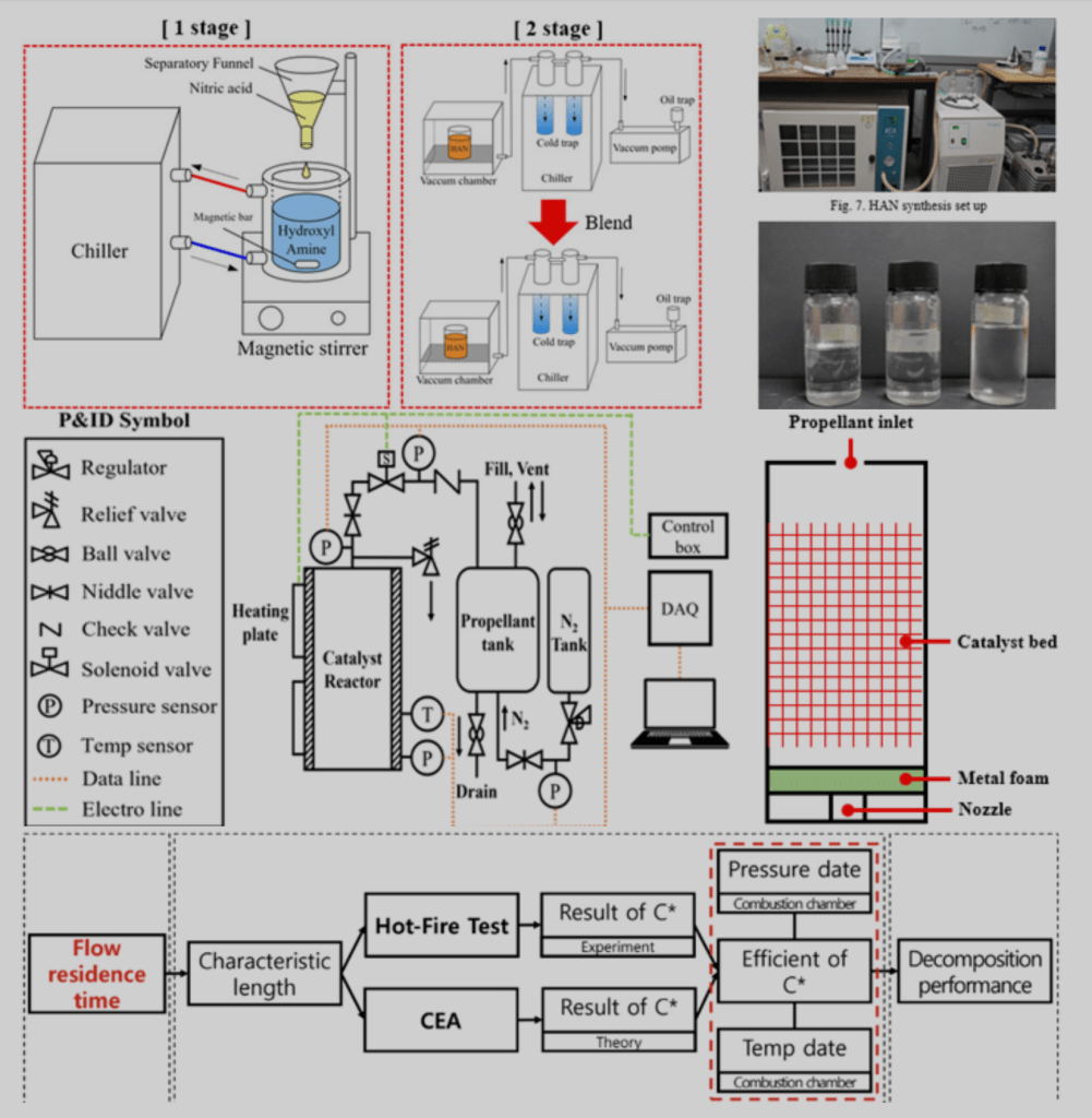 Hydrazine-based thrusters, commonly used in propulsion systems, are toxic, and as a result, there is a growing trend to replace them with environmentally friendly propellants. This study aimed to design a thrust system using the environmentally friendly propellant, HAN (Hydroxylammonium Nitrate). Prior to the design, catalytic reaction system implementation and HAN-based single propellant combustion tests were conducted to assess combustion performance.