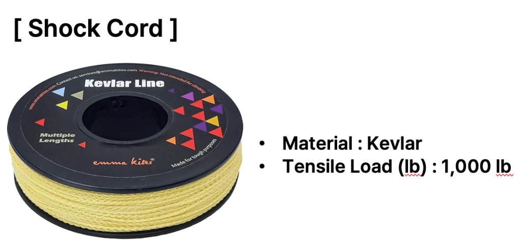 The shock cords for both the drogue and main systems are 26.25 feet long and made of Kevlar with a tensile strength of 1,000 pounds. As shown in the recovery harness diagram, the drogue parachute is positioned 2.5 meters from the nose cone and 5.5 meters from the body tube. Similarly, the main parachute is positioned 2.5 meters from the engine and 5.5 meters from the body. This arrangement is intended to prevent collisions between separated airframe sections during descent.