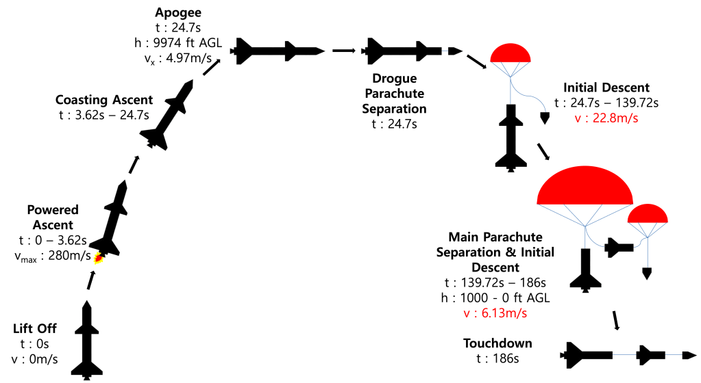 In our recovery system, the drogue parachute is deployed at apogee. The secondary charge is activated 1 second after apogee. The main parachute is deployed at an altitude of 1,000 feet, and its secondary charge is also triggered 1 second after reaching that altitude. The parachute diameters are 2.3 feet for the drogue and 7.22 feet for the main parachute. The descent speed after drogue deployment is approximately 74.8 ft/s, and it reduces to 20.1 ft/s after full deployment of the main parachute. These values are based on simulations conducted using OpenRocket.